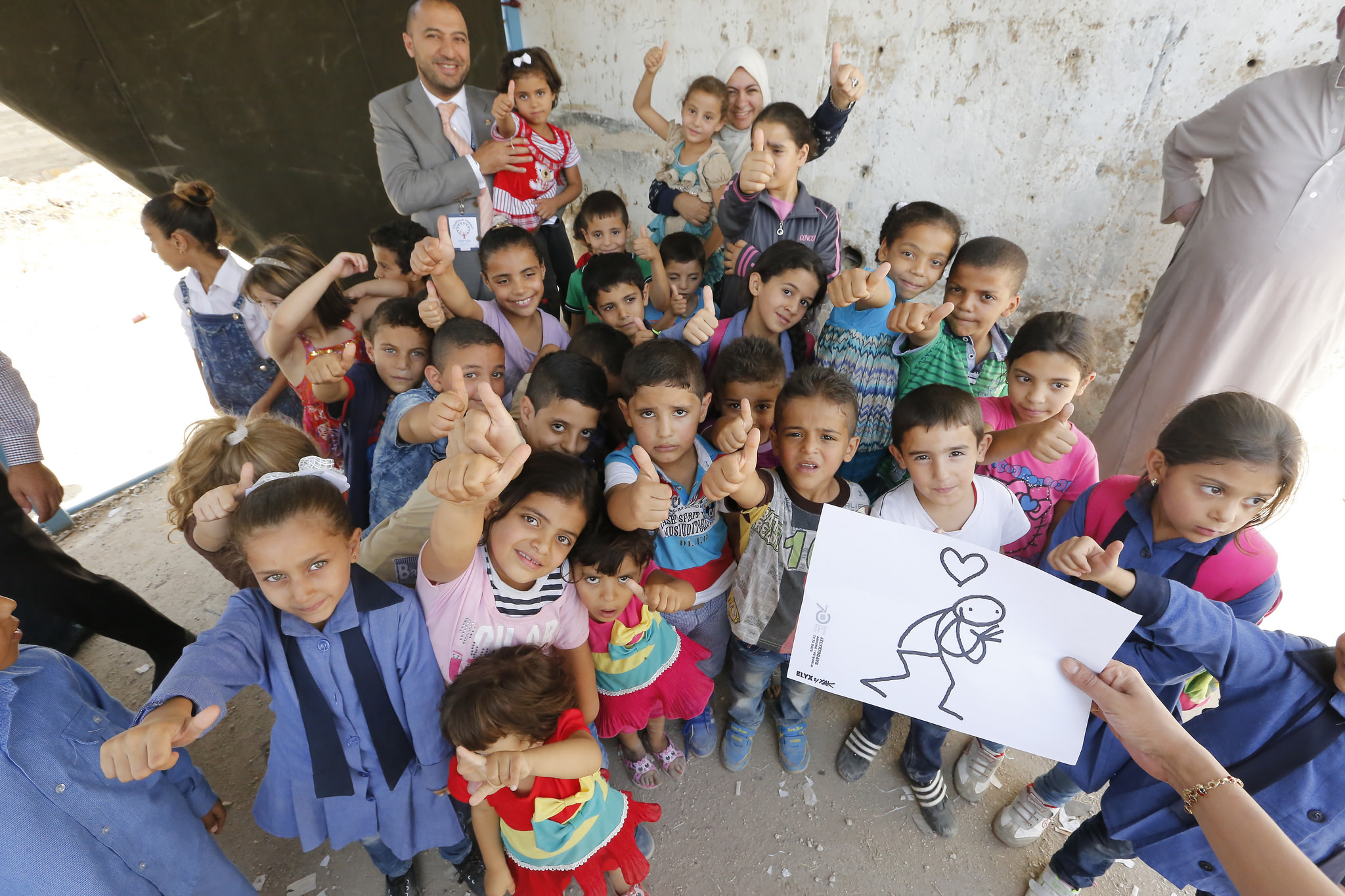 Elyx hangs out with young students from the Nuzha neighbourhood near Amman in Jordan, who have received school bags and stationery donated by the Chalhoub Group to UNRWA. © 2015 UNRWA Photo.